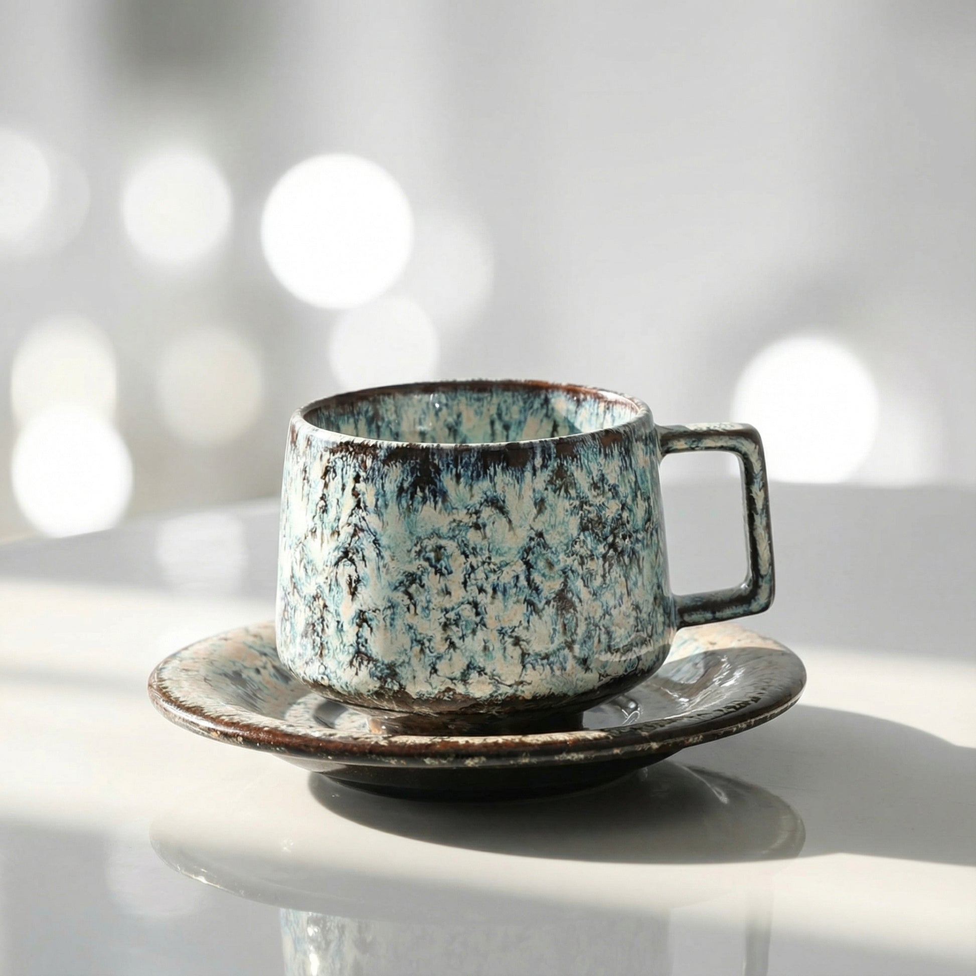 - Handcrafted ceramic coffee cup and saucer set